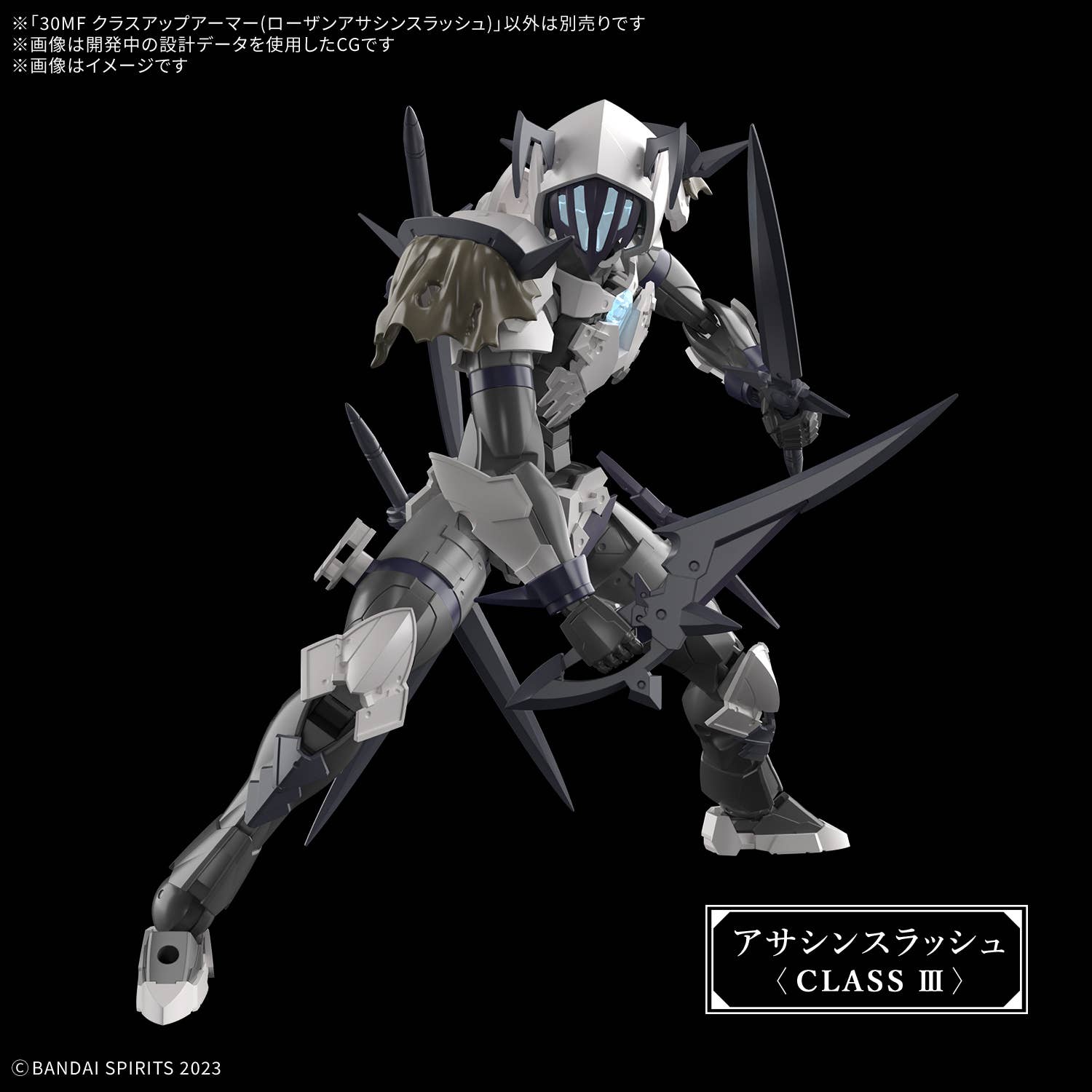 This "Class Up Armor" set from Bandai can be used with their "30MF (30 Minutes Fantasy" series of plastic models. This set of armor and weapons allows your figure to be "classed up" to a higher-tier job with armor replacement -- you can "class up" to Rozen Assassin Slash by combining this armor with that of the Rozen Assassin (sold separately). A long sword and a pair of short swords are included, and the Elemental Core's attribute is "water," and this set has a different face design and coloring from that of the Liber Assassin Slash (sold separately). Place your order today!